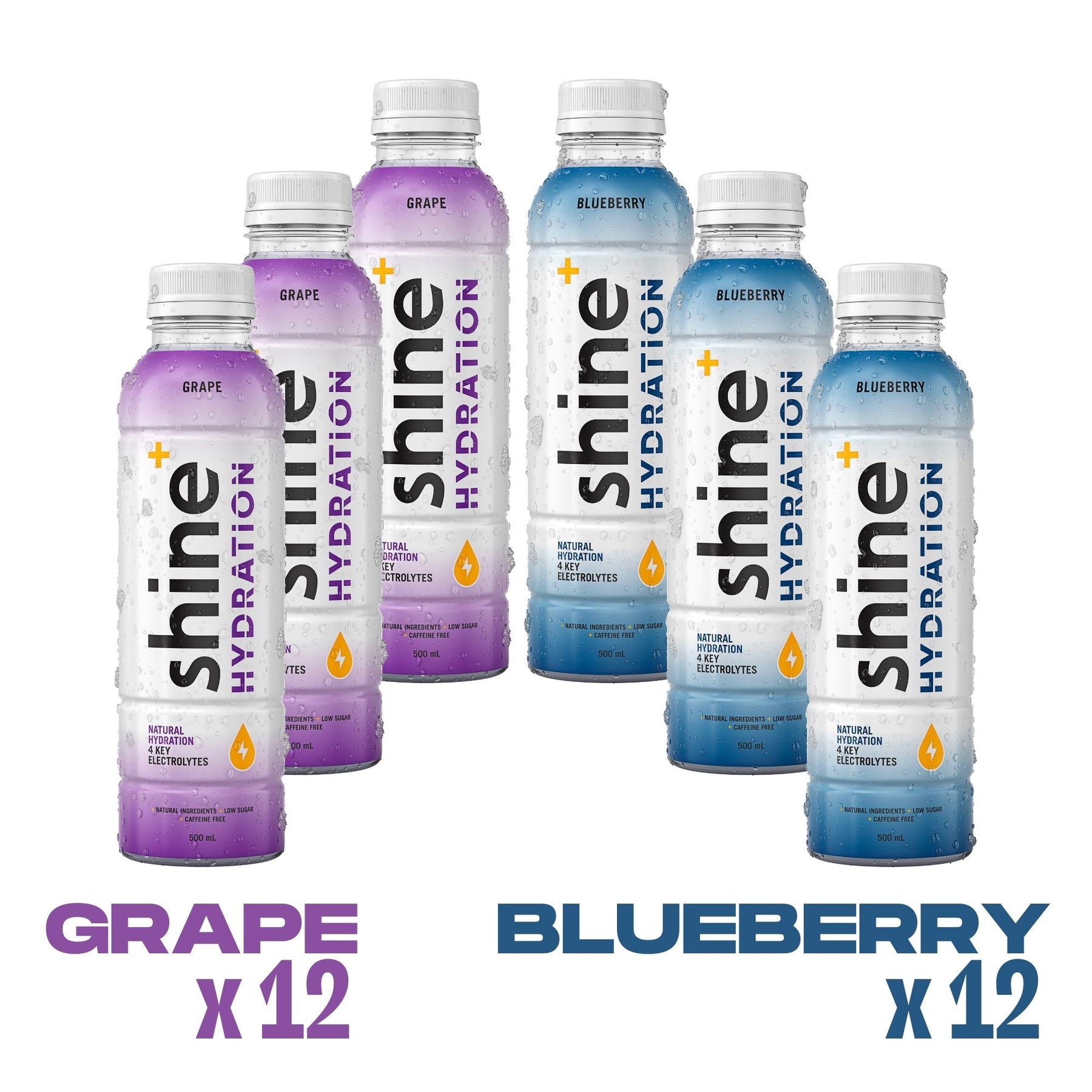 Shine Hydration drinks in grape and blueberry flavors, 500ml bottles with water drops, natural hydration with electrolytes.